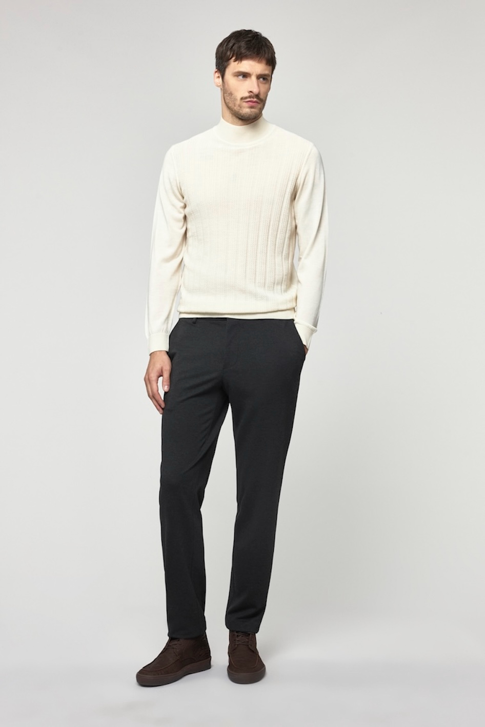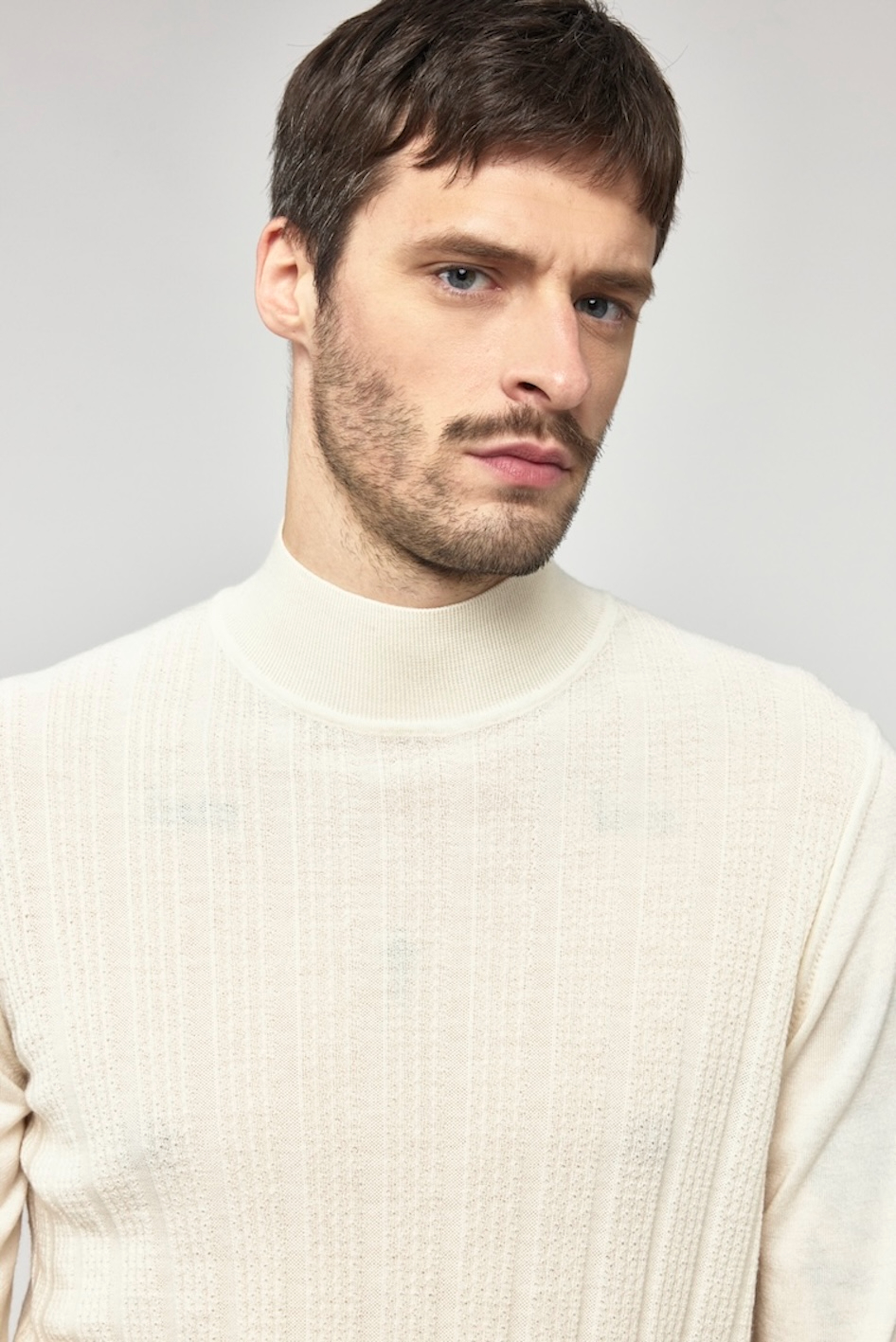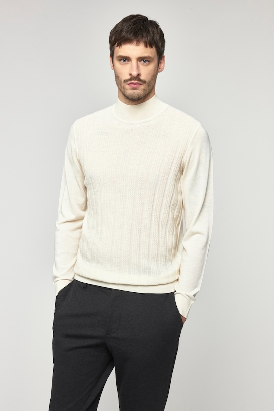 The Isla sweater, featuring knitted details and crafted from mercerized yarn with a modern half-turtleneck design, combines elegance and superior quality. Its breathable structure and stylish knit accents provide all-day comfort, while the contemporary half-turtleneck offers a sophisticated look for any occasion. An excellent choice for those seeking luxury and comfort in perfect harmony.